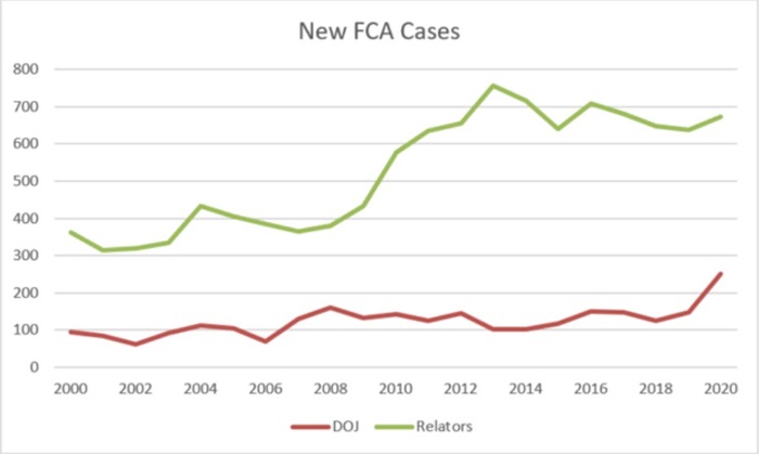 Statistics also suggest that FCA activity is likely to increase. The government and qui tam relators filed a record 922 new FCA cases in 2020, nearly 150 more cases than the prior year. The government was also more active in 2020 than in any other year, filing 250 new cases on its own, an increase of more than 100 from the year before.